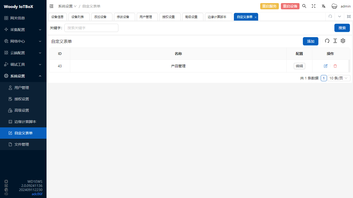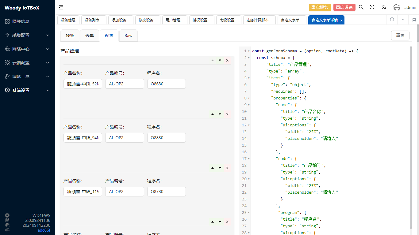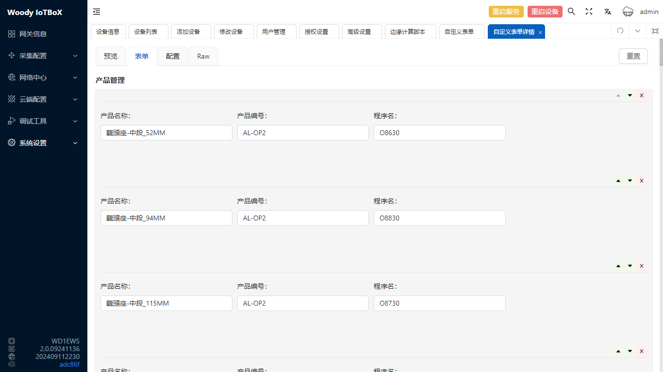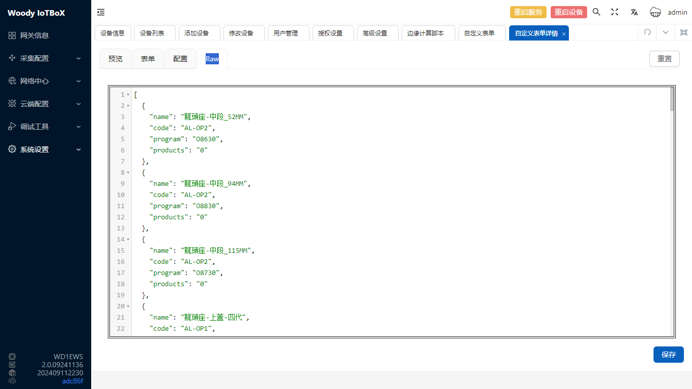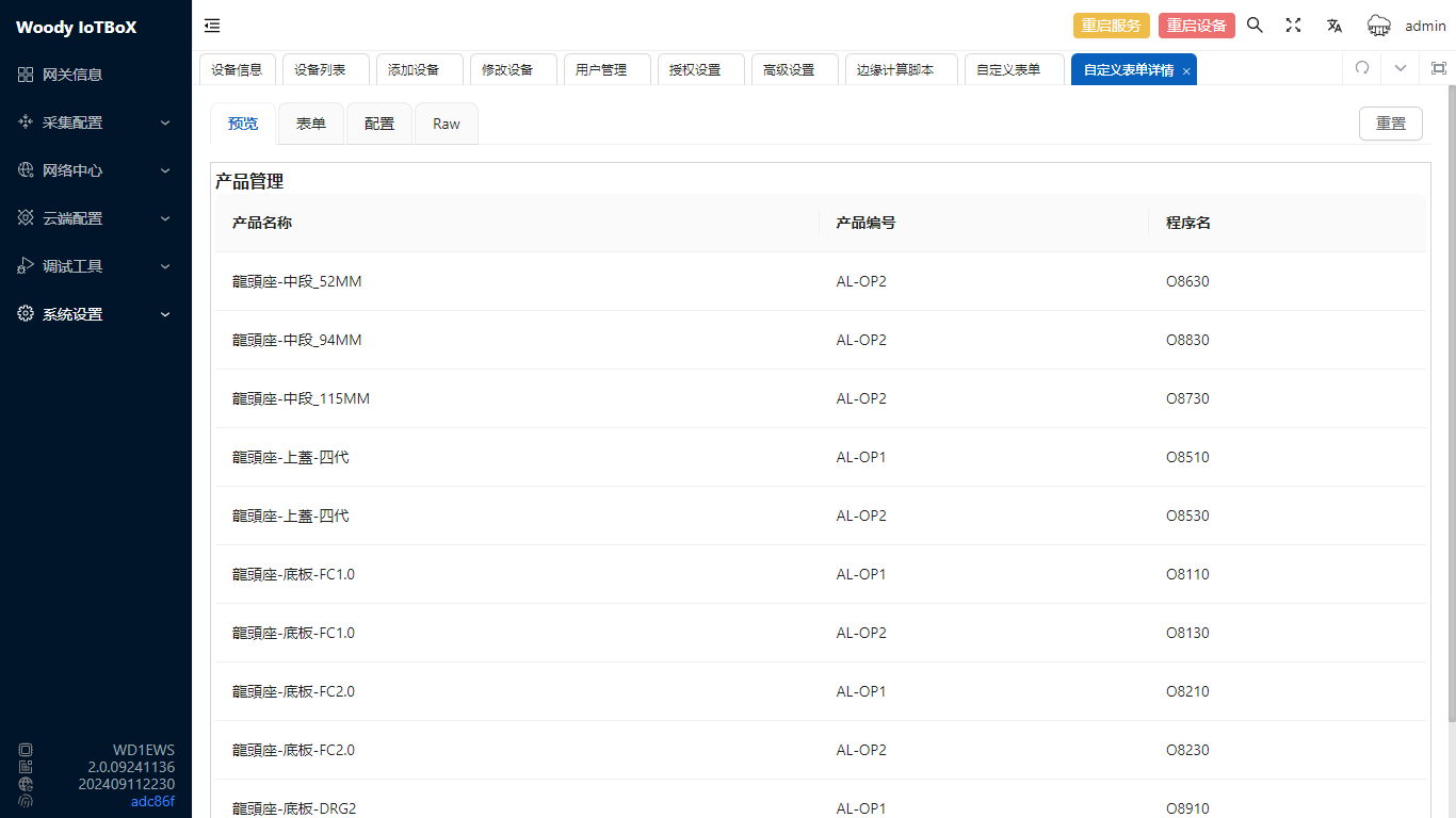 表单编辑页面有四个功能,分别为预览,表单,配置和Raw