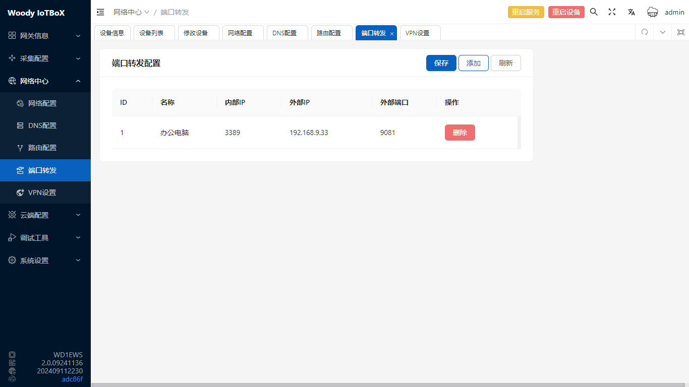 此功能可以将IoTBoX网络内的其他设备端口映射到IoTBoX端口上,可以通过访问IoTBoXip:port访问到对应的映射设备