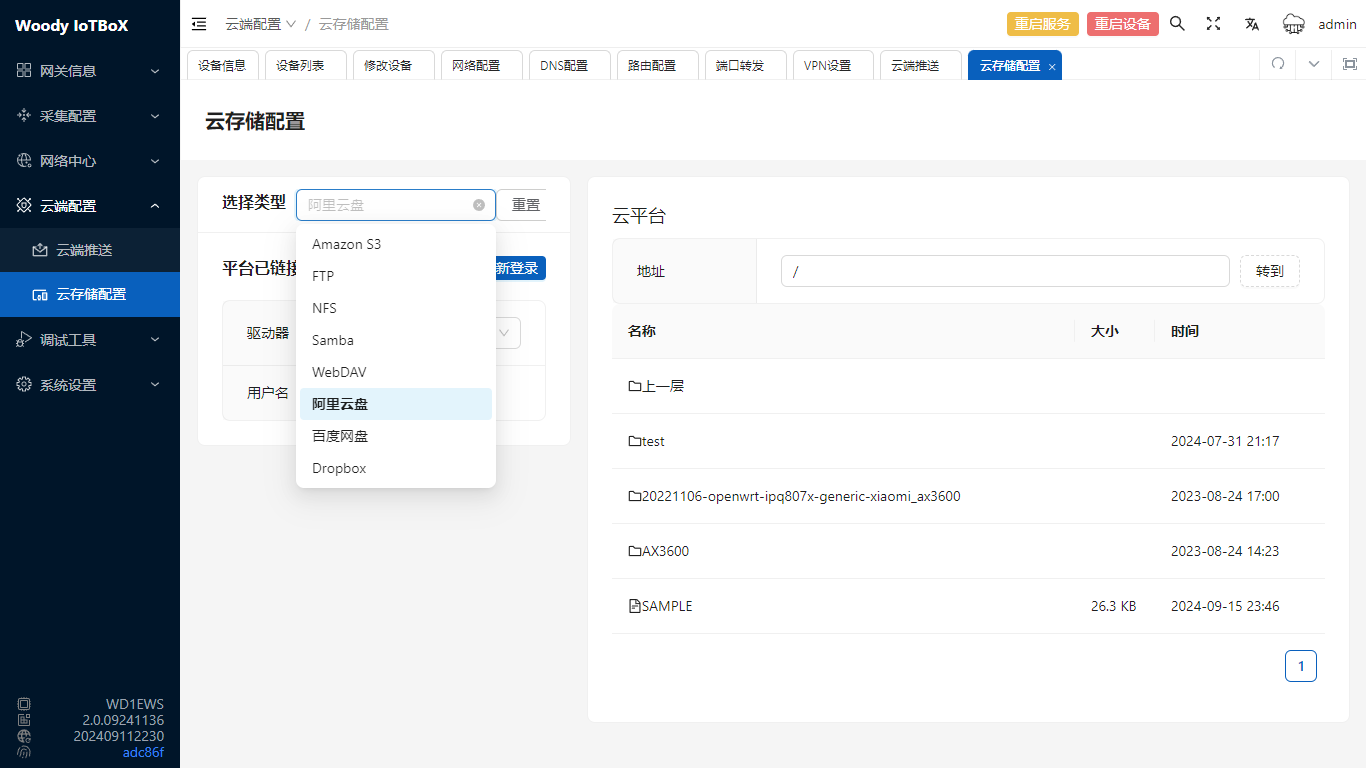 IoTBoX目前支持主流存储协议与云存储商,包括Amazon S3、FTP、NFS、Windows文件共享、WebDav、阿里云盘、百度云盘、Dropbox等,也可以适配更多云存储协议